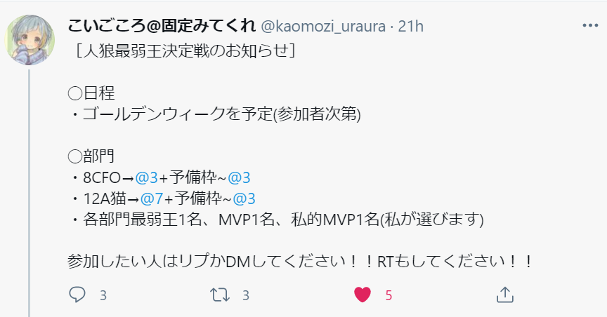 人狼onlineプレイヤーのこいごころさんが最弱王決定戦をするようだ。