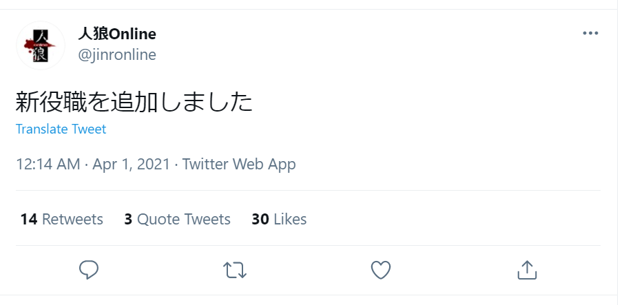 今日(4月1日)、人狼onlineの管理人が新役職を追加したことを発表した。